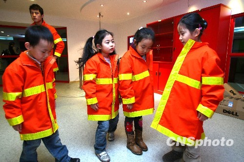 图为小朋友在体验消防员的职业。中新社发 富田 摄