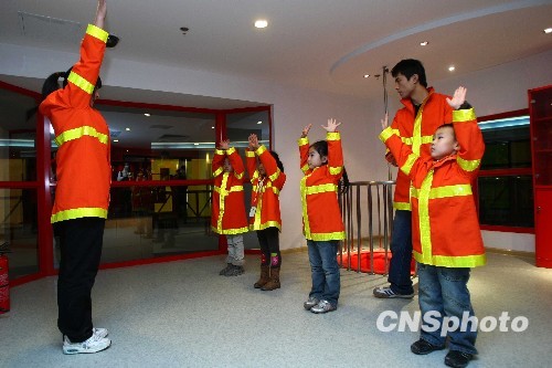 图为小朋友在体验消防员的职业。中新社发 富田 摄