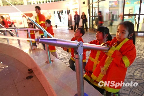 图为小朋友在体验消防员的职业。中新社发 富田 摄