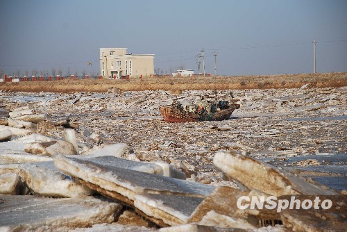 逾十级的渤海“阵风”将最大逾500公斤重的海冰冲上山东东营红光渔港,整个码头被海冰覆盖。中新社发 李波 摄