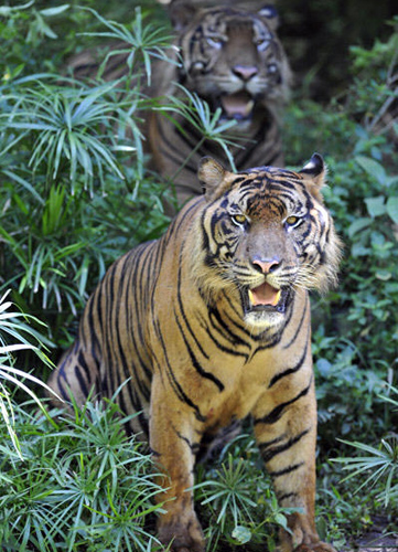 图为1月22日在印度尼西亚首都雅加达拉古南动物园拍摄的两只苏门答腊虎。