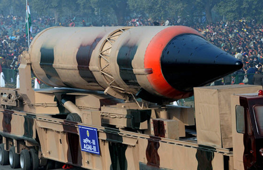 图为一枚“烈火-3”型导弹出现在印度首都新德里的共和国日阅兵彩排现场。