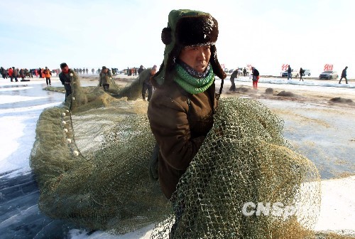 1月23日,新疆福海县冬捕文化节在乌伦古湖冰面上举行,一名渔工正在整理巨大的渔网。乌伦古湖位于新疆西北部福海县境内,水域面积1035平方公里,是中国十大内陆淡水湖之一,作为新疆北部最大的天然渔业基地,冬季冰上大拉网捕鱼是福海县乌伦古湖的传统捕鱼方式,在当地已有50多年历史。这种冬捕方式目前仅存于中国东北松花江和新疆福海乌伦古湖地区。冬季的乌伦古湖由于气候寒冷,湖面冰层厚达50厘米,积雪也达30厘米,在这种环境和条件下捕鱼,当地人叫“踏雪寻鱼”。