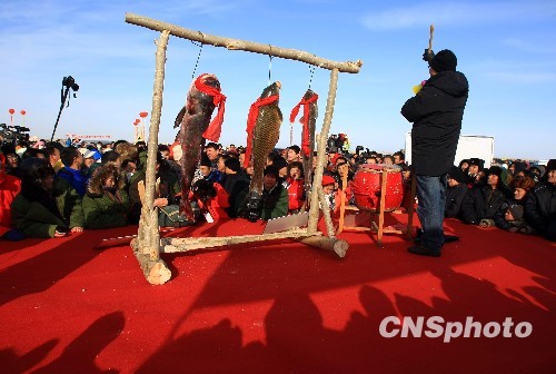 1月23日,新疆福海县冬捕文化节在乌伦古湖冰面上举行,在头鱼拍卖环节中,当天大拉网打上的头鱼被拍出了14000元人民币的高价。中新社发 刘新 摄