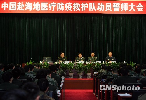 图为医疗防疫队员在北京做出发前的誓师动员大会。中新社发 刘震 摄