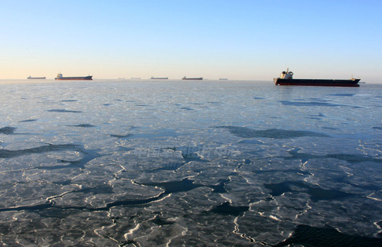 图为被海冰所困,大型货船只好在港口外抛锚。 张雷 摄