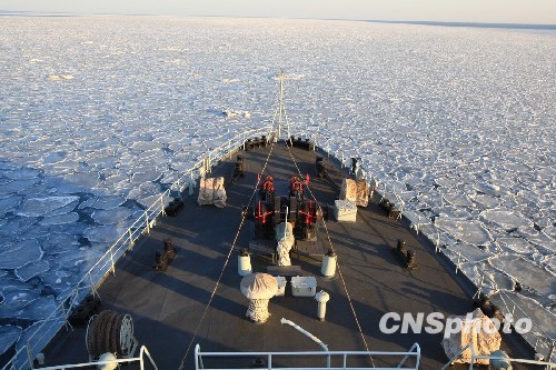 图为中国海军破冰船721号犁开冰层。中新社发 张雷 摄