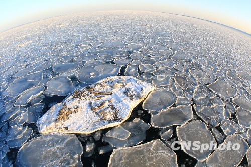 图为巨大的莲叶冰和灰冰块影响货船、渔船航行。中新社发 张雷 摄