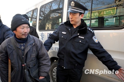 北京警方救助街头流浪乞讨人员。中新社发 李连杰 摄