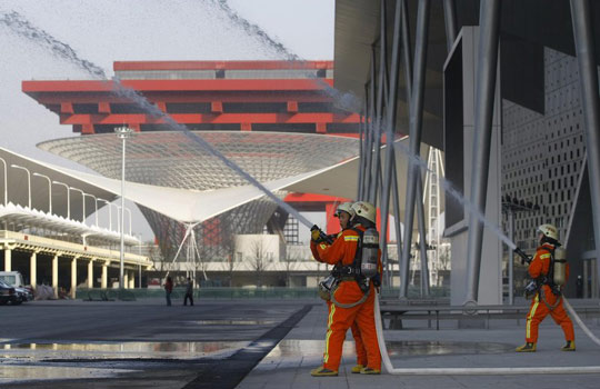 2010年1月25日下午,上海市消防局周渡总队在上海2010世博会主题馆举行消防演习。图为消防队员在火灾演习现场扑救“大火”。