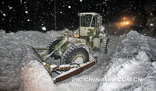 1月25日,数十台车辆和牧民被堵塞在公路上,新疆军区某边防团立即出动推土机、牵引车紧急救援。记者跟随救援车队行动,摄下了官兵们在暴雪中奋战,疏通道路,营救被困车辆的情景,当日23时30分,这段道路被打通。