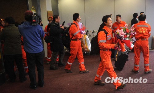 1月27日早晨,48名滞留海地的中国公民(包括1名台湾同胞)搭乘中国政府运送赴海地医疗防疫救护队的民航包机平安抵达首都国际机场。由外交部、国家地震局、福建省、广东省和北京市政府相关负责人联合组成的撤侨工作组同机返回。回国公民所在地各有关地方政府均派员前往首都机场迎接并协助照料。中新社发 钟新 摄