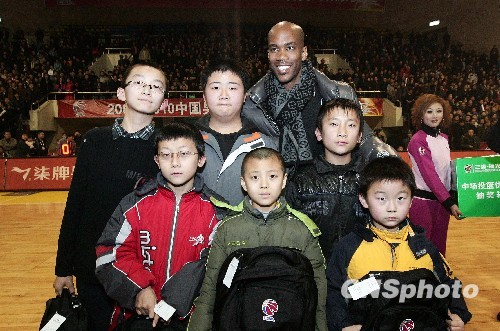 图为马布里向小球迷捐赠体育用品。中新社发 张云 摄