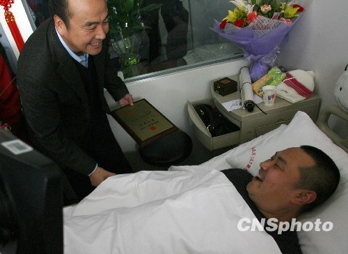 1月28日,中国红十字会常务副会长王伟在北京307医院为志愿者李勇颁发造血肝细胞捐赠证书。中新社发 苏丹 摄