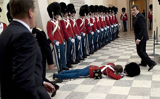 1月27日,丹麦女王在首都哥本哈根设宴款待议会议员,一名皇家卫兵突然晕倒在地,不知是否站得太久饿晕了。