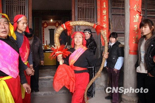 图为表演者“请”出“神鞭”。中新社发 吕学杰 摄