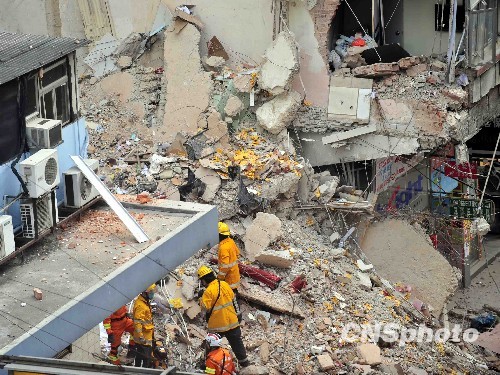 香港红磡马头围道一座5层高旧楼,二十九日中午突然全幢倒塌,造成至少2死2伤。消防出动特种搜救队搜救。中新社发 谭达明 摄