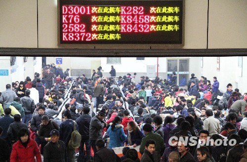 1月30日,为期40天的2010年全国春运工作拉开帷幕。许多在苏州的外来务工人员及寒假大学生归心似箭,纷纷结伴赶乘春运头班车,苏州火车站迎来今年春运的第一个客流小高峰。 中新社发 王建中 摄