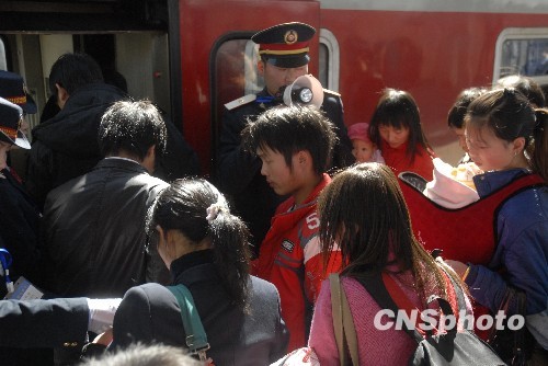2010年春运今日正式拉开帷幕。今年春运从1月30日起至3月10日结束,根据昆明铁路局方案,为期40天的春运中,预计发送旅客334万人。昆明火车站的有关负责人介绍,从1月27日开始,昆明火车站每日的客票发售量在4.5万张以上,预计从2月5日左右开始,农民工和返乡探亲人流将高度叠加,昆明火车站的售票和旅客发送量都将迎来一个高峰。 图为,等候上车返乡的乘客有序排队上车。中新社发 田洪 摄