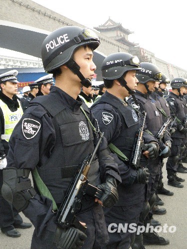 1月29日,西安警方在西安火车站广场举行2010年春运安全保卫工作誓师大会。春运期间,西安警方将全天候24小时开展巡逻布控、治安整治和严打各类违法犯罪工作,全力为春运创造好社会治安环境,确保“平安春运”“和谐春运”。中新社发 王振 摄