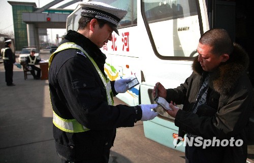 1月30日是春运启动日,河北高速交警在各条高速公路口,对“三车”(即超员客车、非法运输烟花爆竹等危险品运输车、客货混装车)进行严查,检查是否存在客车超员、客货混装、无证驾驶、不具备营运驾驶资质、危险品运输车辆不按规定时间行驶等交通违法行车,以确保春运道路安全。中新社发 翟羽佳 摄