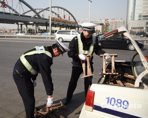图为河北高速交警在京珠高速站口,将查获超载客车的“软凳”没收。中新社发 翟羽佳 摄