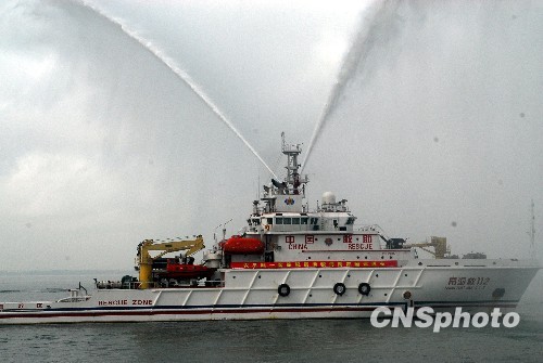 1月30日,春运第一天,交通部南海救助局海口救助基地动用辖区三艘先进救助值班船,在琼州海峡开展大型救助巡航和考察春运航行活动,并展开了一场别开生面的海上救助技能演练。随着海南国际旅游岛建设正式上升为国家战略,海南游再次升温,预计今年春运期间走琼州海峡水路进出海南岛的旅客和车辆都将大幅增长,水上交通安全服务和救助任务也会大大加重。中新社发 善平 摄