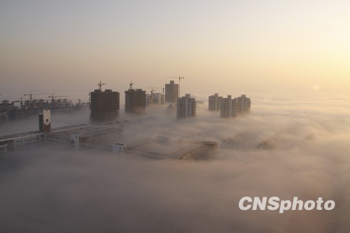 1月31日,山东蓬莱市出现平流雾现象,建筑被浓雾缠绕,时隐时现,宛如仙境,美不胜收。吸引了市民和摄影爱好者观看、拍照。中新社发 于良意 摄
