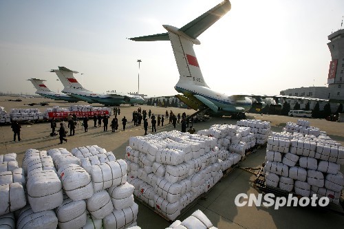 1月31日,中国政府向蒙古国提供的人道主义救援物资在河北石家庄国际机场开始装机待发,运输任务由空军某部的三架军用运输机明日起飞运往蒙古。入冬以来,蒙古国遭遇30年罕见大雪和低温天气袭击,90%国土被大雪覆盖,恶劣天气已造成100多万头牲口死亡,许多牧民被困。为帮助蒙古国克服雪灾天气,中国政府决定提供一批紧急人道主义物资援助。这批物资包括灾区急需的便携式发电机、食品和御寒棉被等,另有一批大米近日通过铁路运输方式交付蒙方。图为石家庄国际机场整装待发的救援物资。中新社发 刘震 摄