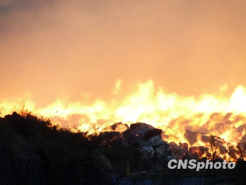 青岛一物流仓库露天堆场起火。中新社发 杨利华 摄
