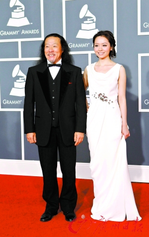 图为张靓颖与喜多郎共同登上格莱美红地毯。