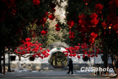 北京地坛公园万盏红灯迎新年。中新社发 张郎 摄