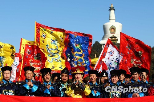 2月3日,在中国传统节日春节即将到来之际,由北海公园的工作人员扮成的皇帝和大臣们在白塔前祝福海内外民众新春快乐。中新社发 富田 摄