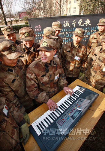 为战友们教唱歌曲。邓元生 黄锟 摄