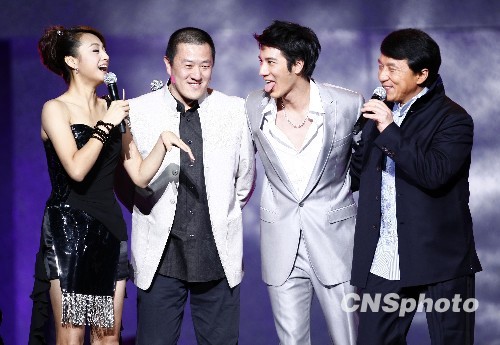 2月3日晚,成龙新片《大兵小将》迎春首映礼在北京举行,主演王力宏在典礼上吐舌头,逗乐曹颖。图为曹颖、导演丁晟、主演王力宏、成龙在典礼上。中新社发 杜洋 摄