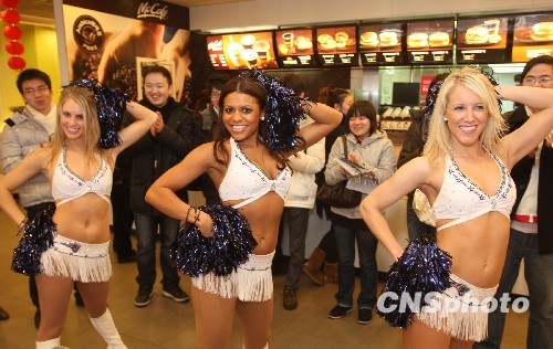 2月4日,3位来自美国NFL啦啦队的成员在上海街头激情热舞,为即将举行的美国橄榄球联盟NFL的总决赛“超级碗”造势。中新社发 汤彦俊 摄