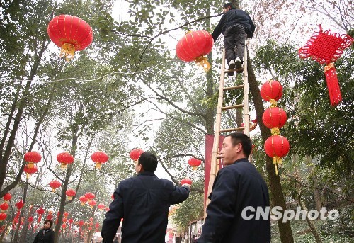 图为工作人员正在高挂大红灯笼。中新社发 张浪 摄