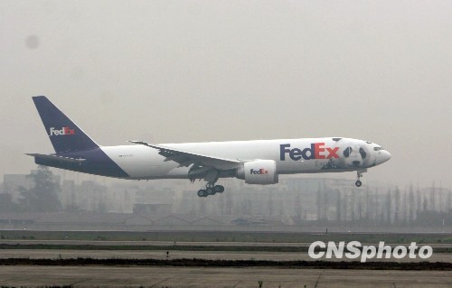2月5日16时26分,大熊猫“泰山”、“美兰”搭乘联邦快递的“熊猫专机”抵达成都双流国际机场。