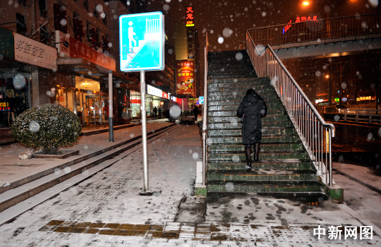 图为雪中行人在道路上行走。中新网记者 金硕 摄