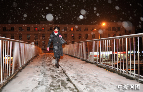 图为雪中行人在道路上行走。中新网记者 金硕 摄