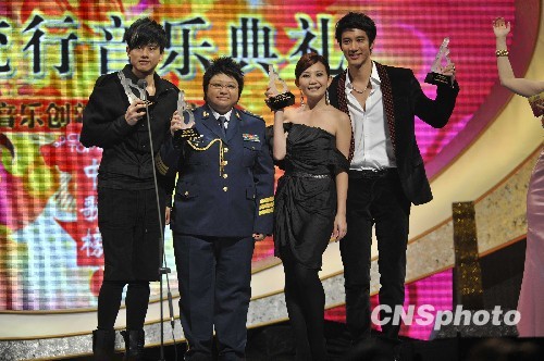 图为梁静茹韩红获得年度最受欢迎女歌手奖,王力宏张杰获得年度最受欢迎男歌手奖。中新社发 李学仕 摄