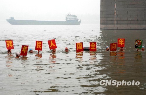 2010年2月7日,新春佳节来临之际,约200名武汉冬泳健儿在武昌汉阳门以冬泳形式,向全国和武汉人民贺新年。中新社发 楚天行 摄