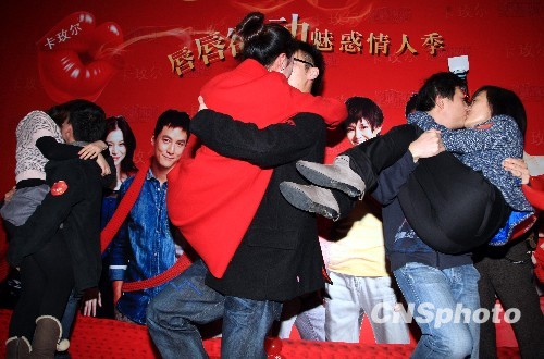 2月7日,214对情侣在上海正大广场激情热吻,演绎“全城热恋”真实版,角逐“最浪漫”、“最激情”、“最神秘”的热吻达人头衔。