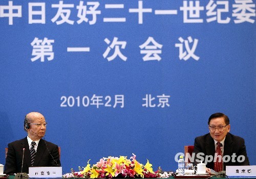 2月7日下午,第五届中日友好21世纪委员会第一次会议在春雪后的北京钓鱼台国宾馆开幕,中方首席委员、原中国国务委员唐家璇(右)与日方首席委员、东京证劵交易所会长西室泰三分别发表基调发言。中新社发 任晨鸣 摄