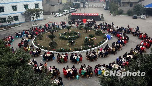 春节前夕,四川华蓥市一企业用“坝坝宴”的形式宴请外来民工的全过程。 “坝坝宴”是川东民间宴请客人的一种传统方式,因其设宴于院坝头, 又称"九斗碗"。“坝坝宴”最能体现出川东人的吃相。但要吃出味道,吃出氛围,在形式和内容上肯定都是大有考究的。在形式上,食客要多多益善,吃饭如同打一场歼灭战,声势要大大的,兵员要旺旺的,动作要猛猛的。在内容上,“九大碗”是起码的。之所以叫“九大碗”,是因“九”字含吉祥之意,民间有“九九长寿”、“九子登科”、“天长地久(九)”等说法。