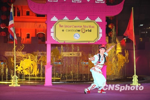 7日晚的曼谷市中心中央世界广场,灯笼高挂,锣鼓喧天,歌舞升平。为庆祝农历春节和泰中建交35周年,由泰国国家旅游局和中国政府文化部、中国驻泰使馆联合举办的“欢乐春节2010”虎年庆新春活动正在如火如荼地演出。参加当晚演出的有来自中国辽宁、吉林、黑龙江、广西、内蒙古和北京六个艺术团体。悠扬的中国传统民族音乐、人偶共舞的木偶剧《天鹅湖》、虎虎生威的武术《百兽争王》、高难度的《顶花坛》杂技等节目不时博得在场泰国观众的阵阵掌声。
