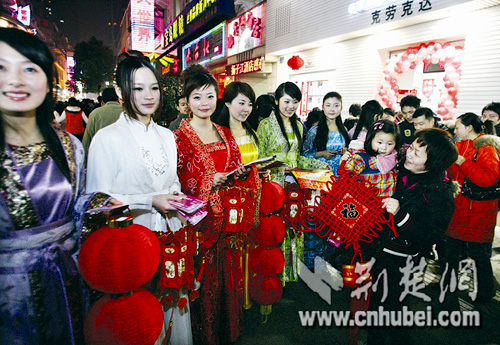 2月7日晚,来自武汉7所高校的7位女大学生身着汉服,手提花灯和中国结来到江汉路步行街,免费向过往市民发放东湖楚风园民俗花灯节的旅游消费券。据介绍,7位女大学生都是东湖楚风园花灯节的花灯女郎形象大使。