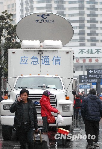 2月7日,上海火车站进站口大门前,中国电信“应急通信”车在候车广场上执勤,确保现场通信畅通。
