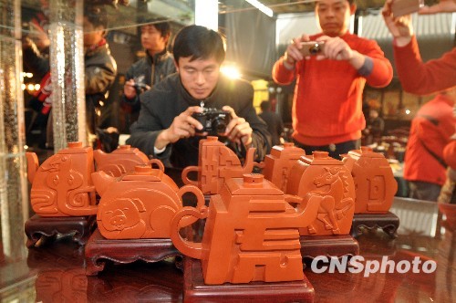 2月8日,著名紫砂壶艺大师许四海在北京推出十二生肖字形壶,贺岁庚寅新年。十二生肖字形壶突破了中国制壶五百年历史一贯的模式,首次将汉字与现代雕塑合二为一。这十二款壶一面是十二生肖雕塑,一面刻有表示生肖属相的汉字,一壶二体,巧妙融合。作为上海世博会“世博壶”的设计者,许四海表示,十二生肖字形壶是生肖文化、汉字文化与紫砂文化的结合,以这种方式表现独有的中华文化,是对传统文化的传承。