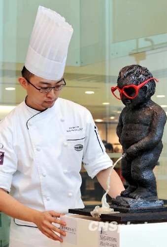 香港甜品总厨古嘉俊师傅在《朱古力美术馆by Chef Koo》展览上介绍展品。中新社发 洪少葵 摄